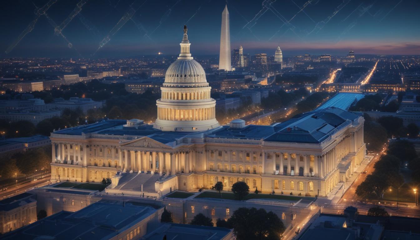 A futuristic city showcasing blockchain innovation and its regulatory impact.